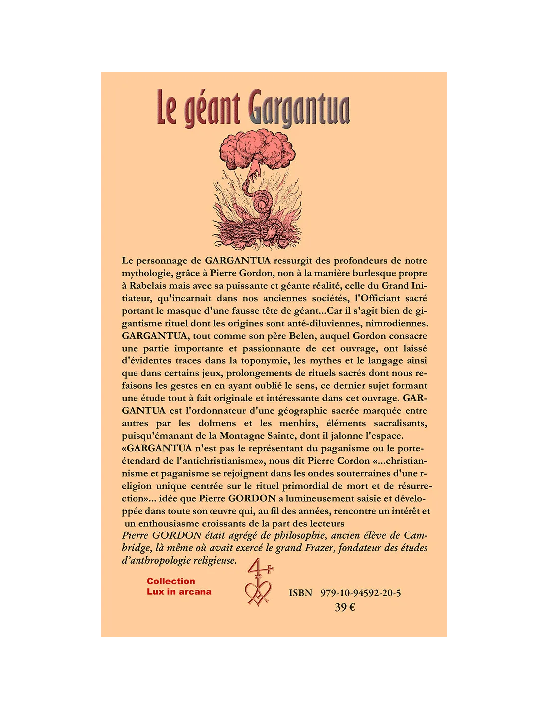 «GARGANTUA n'est pas le représentant du paganisme ou le porte-étendard de l'antichristianisme», nous dit Pierre CORDON, «...christianisme et paganisme se rejoignent dans les ondes souterraines d'une religion unique centrée sur le rituel primordial de mort et de résurrection»... idée que Pierre GORDON a lumineusement saisie et développée dans toute son œuvre qui, au fil des années, rencontre un intérêt et un enthousiasme croissants de la part des lecteurs.
