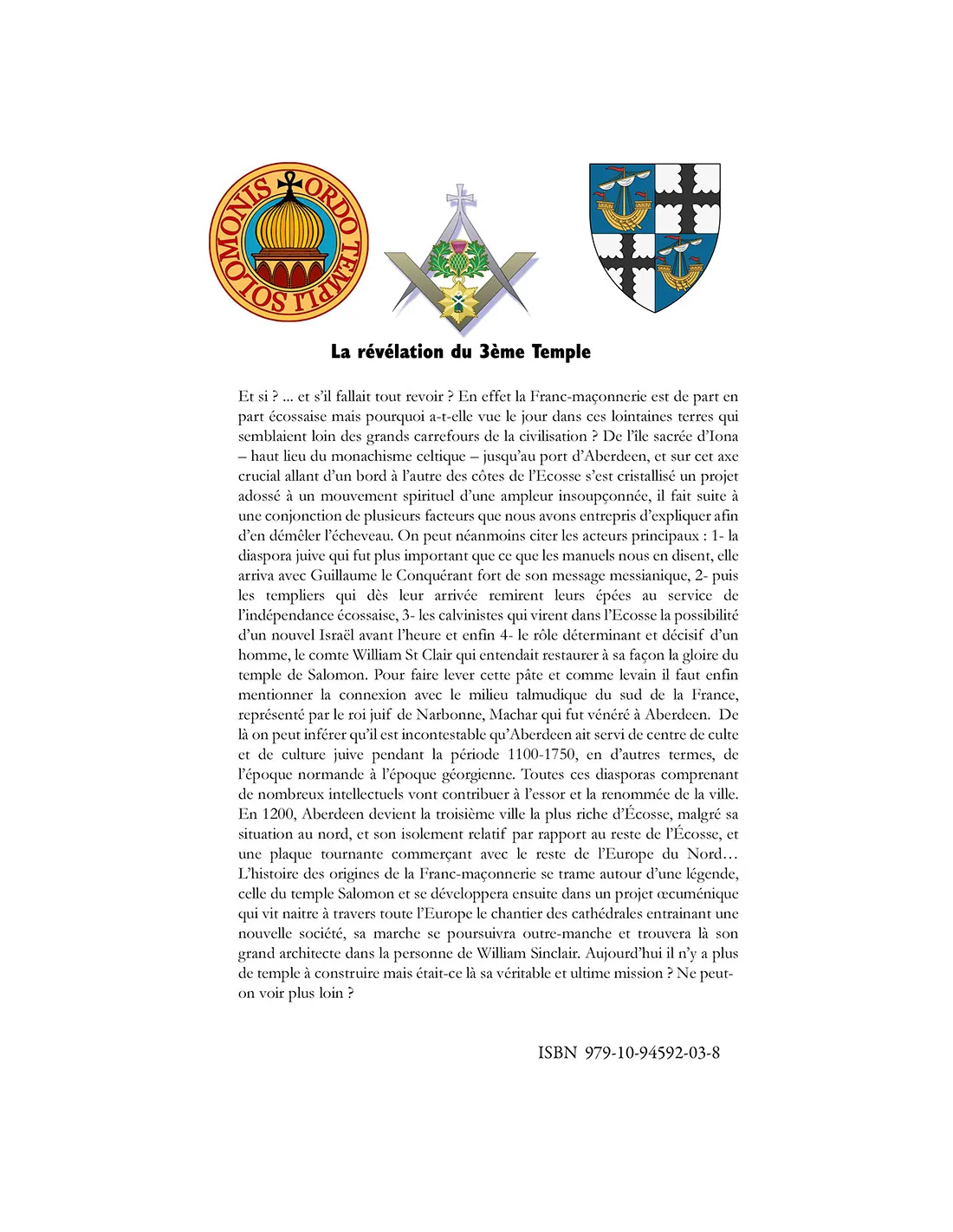 En 1200, Aberdeen devient une plaque tournante commerçant avec le reste de l’Europe du Nord… L’histoire des origines de la Franc-maçonnerie se trame autour d’une légende, celle du temple Salomon et d’un rite - le mot de maçon - issu de la fusion de deux traditions, judaïque et chrétienne. Elle se développera ensuite dans un projet œcuménique - la Christiana Res Publica, qui vit naitre à travers toute l’Europe le chantier des cathédrales entrainant une nouvelle société et aussi une nouvelle utopie, sa marche se poursuivra outre-manche et trouvera là son grand architecte dans la personne de William Sinclair. C’est aussi en Ecosse que fusionnèrent plusieurs filiations : celle du Saint Graal et la filiation hiéro-solymitaine - des chanoines de Jérusalem et de leurs successeurs se réclamant des bâtisseurs du Temple de Salomon. Aujourd’hui il n’y a plus de temple à construire mais était-ce là sa véritable et ultime mission ? Ne peut-on voir plus loin ? des questions auxquelles ce travail apporte des éclairages.